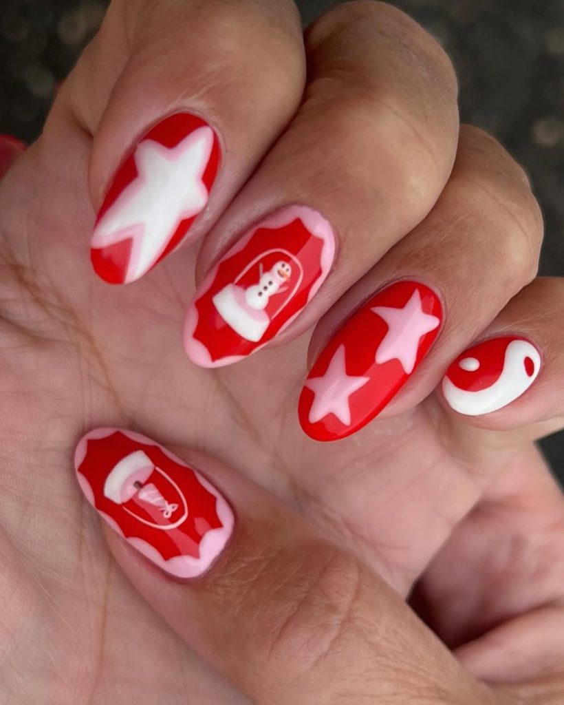 Glossy candy Red dominates, framed by powder-pink borders and filled with bold white stars, a kitschy snow globe, and a cheeky yin-yang. The tapered Almond silhouette keeps the graphic Art designs chic—like a vintage ornament collection reimagined.