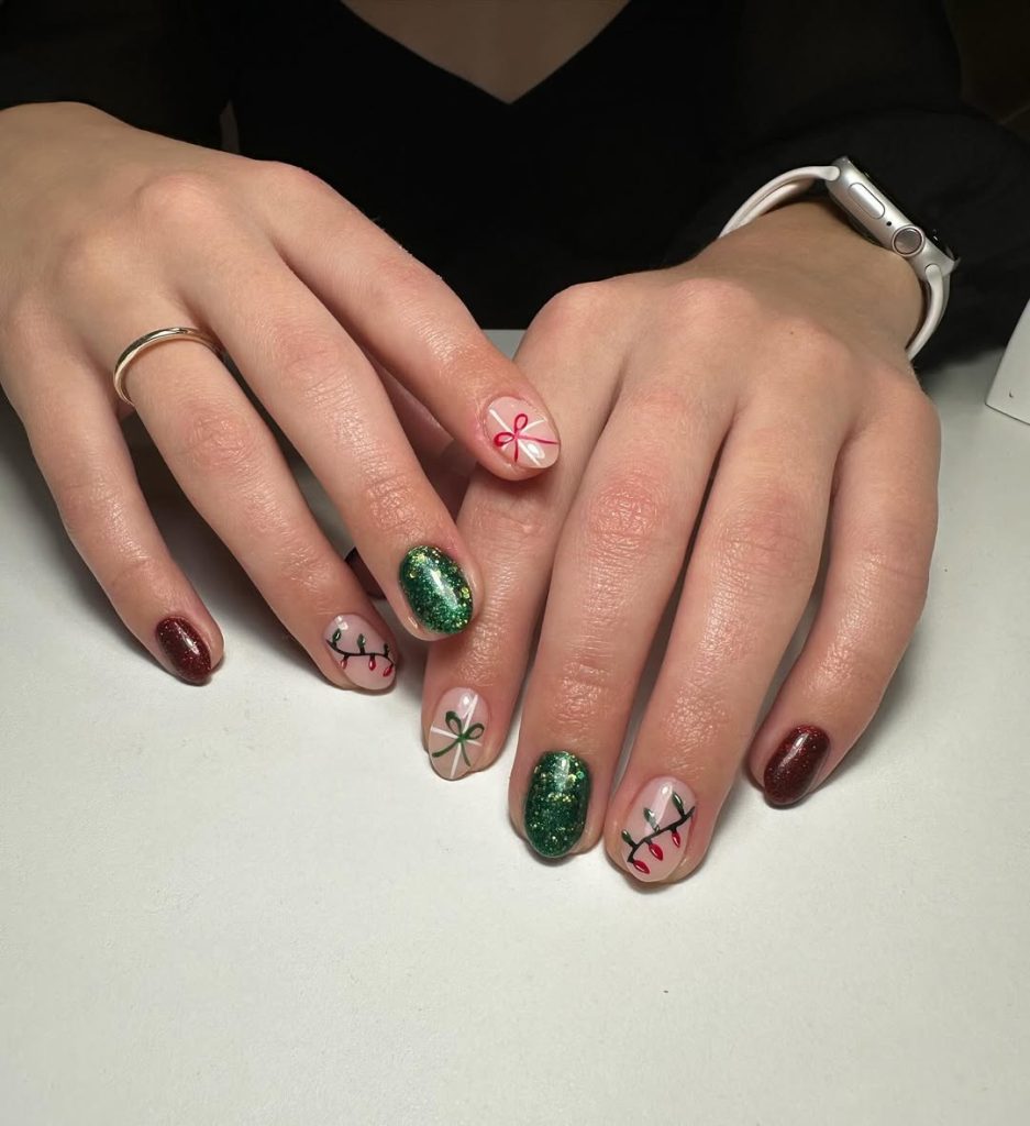 A joyful medley: sparkling emerald on a couple of nails, ribbon bows, peppermint stripes, and a string of tiny lights winding across blush-nude. The lengths are everyday Short ovals—perfect for baking marathons and gift wrapping.