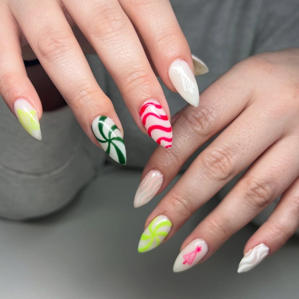 High-energy holiday: stiletto Almond tips washed in milky white and shot through with neon swirls—chartreuse and forest pinwheels, hot-pink candy stripes, and minimal linework trees. It’s playful, photogenic, and Super modern.
