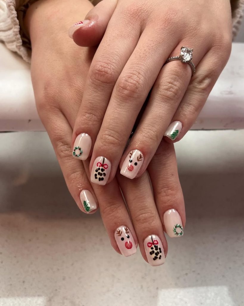 Glossy nude squares dotted with tiny holiday icons—Rudolph noses, petite wreaths, pine sprigs, and gift bows. The proportions are intentionally Short and neat, so the playful Art still reads chic for work hours and dinner reservations.