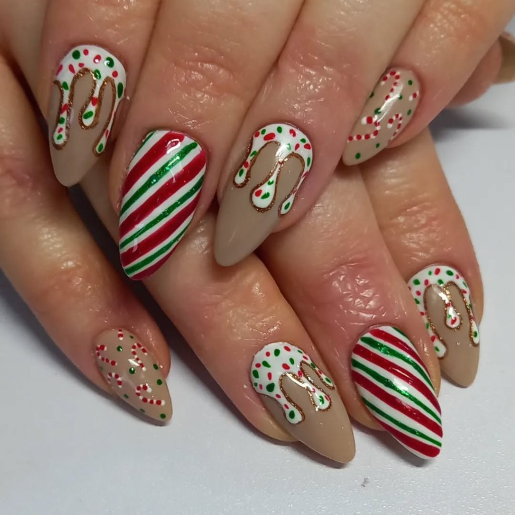 Warm latte base with white “icing” drips edged in metallic, dotted sprinkles, and diagonal Red and green stripes. The tapered Almond silhouette makes the dessert theme feel sophisticated rather than sweet-tooth literal.