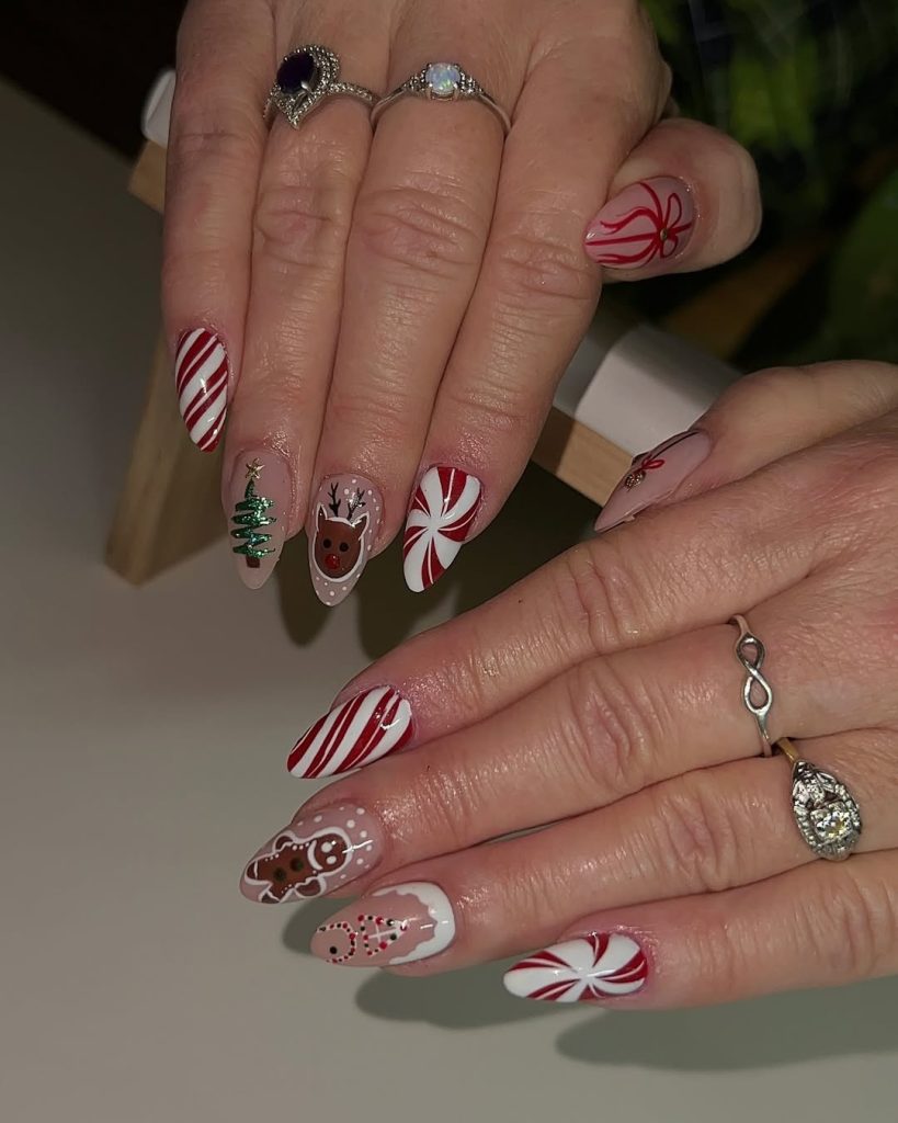 All the greatest hits—striped peppermints, a glossy evergreen, Rudolph, ribbon rosettes—on medium Long almonds. The palette stays crisp with snowy white and high-shine Red , so the variety feels curated.
