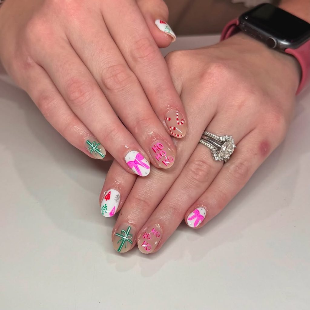 A delightfully modern palette—icy white, blush, and neon mint—starring oversized bows, candy canes, tiny trees, and playful “HO HO HO” lettering. The length stays practical ( Designs short /medium), ideal for typing and gift-wrapping.