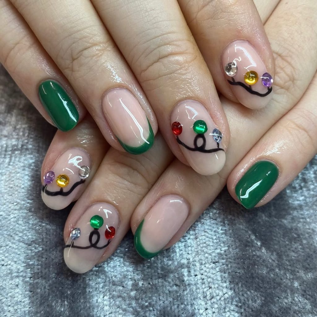 High-gloss Green on a couple of nails, sheer-nude with slim emerald French tips on others, and a whimsical string of “bulbs” made from tiny rhinestones. The oval length is wearable and holiday-party photogenic.