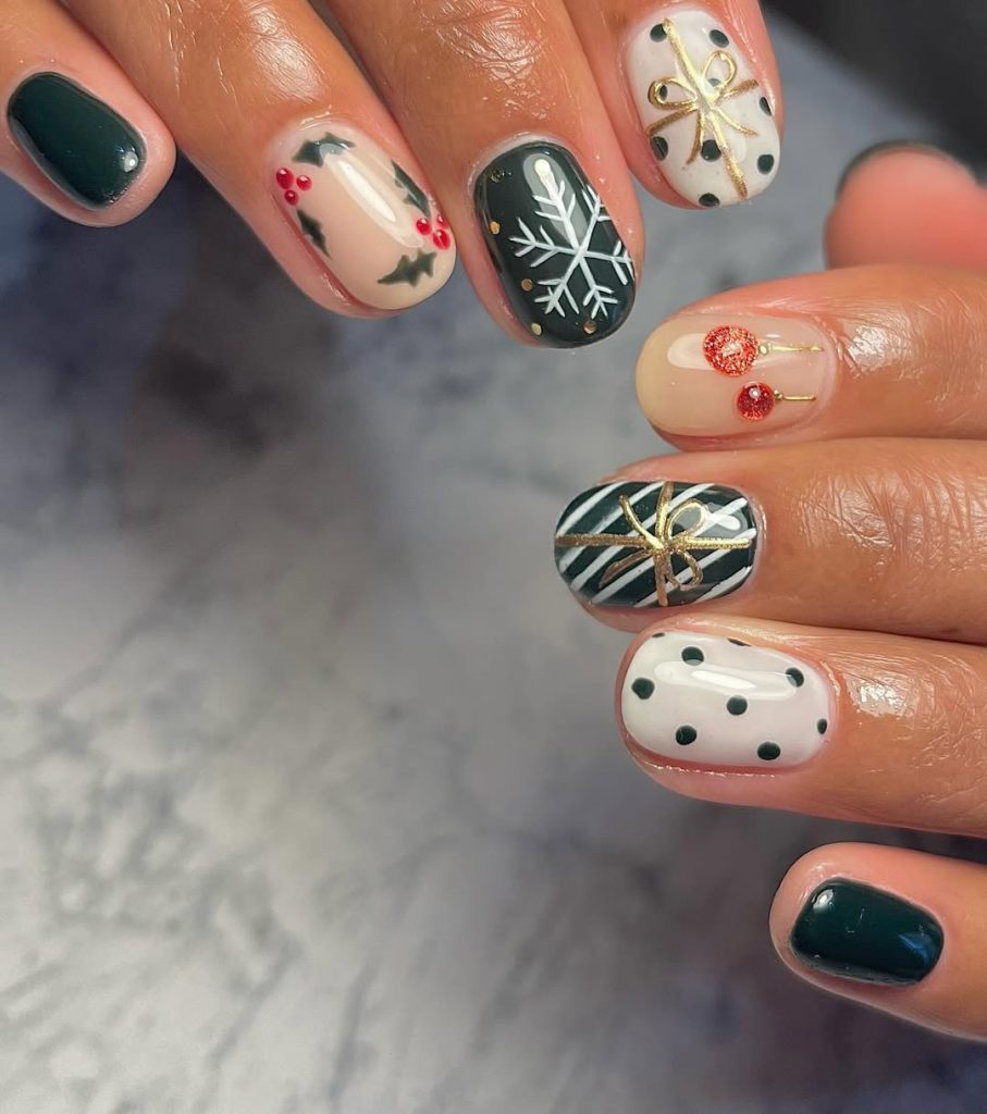 Deep forest Green meets ivory with luxe gold bows, dotted “wrapping paper,” a crisp snowflake, and glossy berries. The proportions stay comfortably Short , which makes the mix-and-match Art designs look elevated and easy to wear Monday through the office party. Ask for a high-shine Gel topcoat so the metallic lines stay razor sharp through all of December.