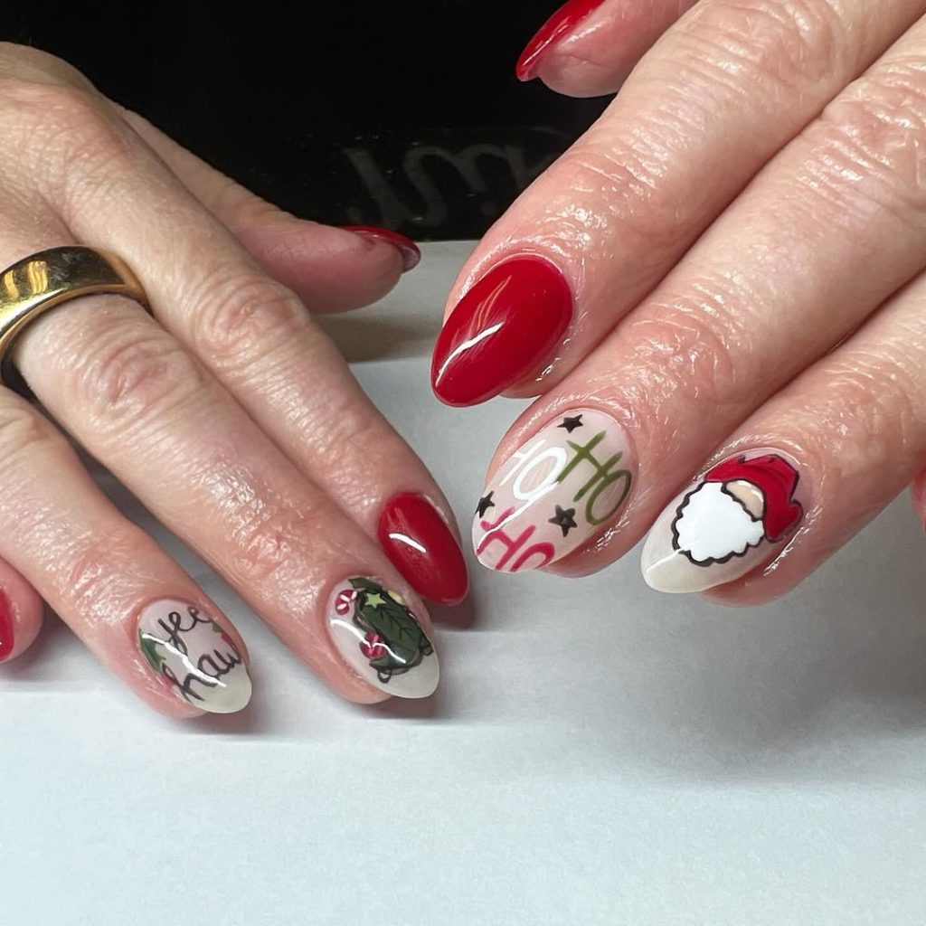 Glossy candy Red saturates most nails while two accents deliver personality: playful “Ho Ho Ho” typography and a minimalist Santa cameo. The softly tapered Almond shape reads glamorous but practical for gift-wrapping marathons.