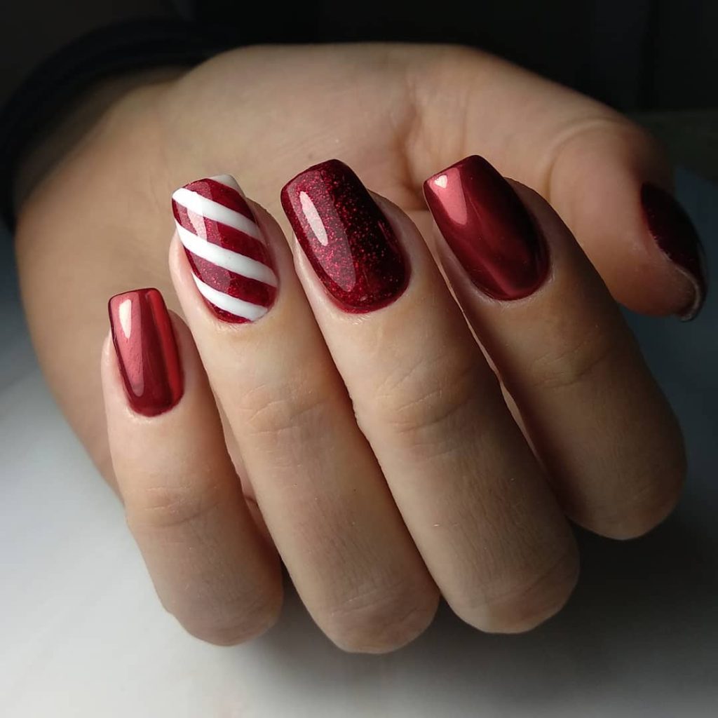 Metallic merlot meets two accents: micro-glitter red and a diagonal candy-cane stripe. The silhouette is sleek Square , medium-short, with mirror sheen that looks luxe but wearable.