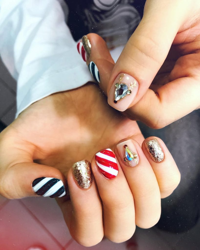 A joyful mash-up: red-and-white and navy-and-white stripes, full-glitter gold, and a jewel-topped reindeer accent. The lengths are practical and Short —great for gift-wrapping marathons.