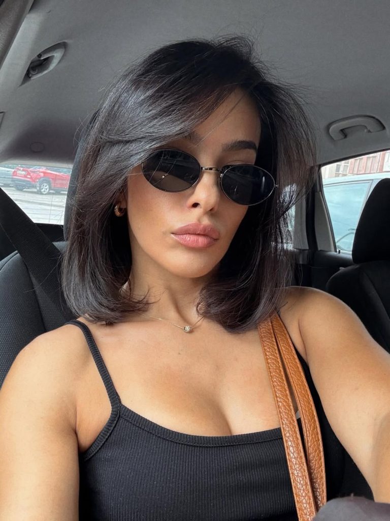 Style pairing: a charcoal tank in a clean, minimal cut is perfect with this hair—simple neckline, modern vibe. Add small gold hoops or a sleek chain, and you’ve got that “model-off-duty” polish without trying.
