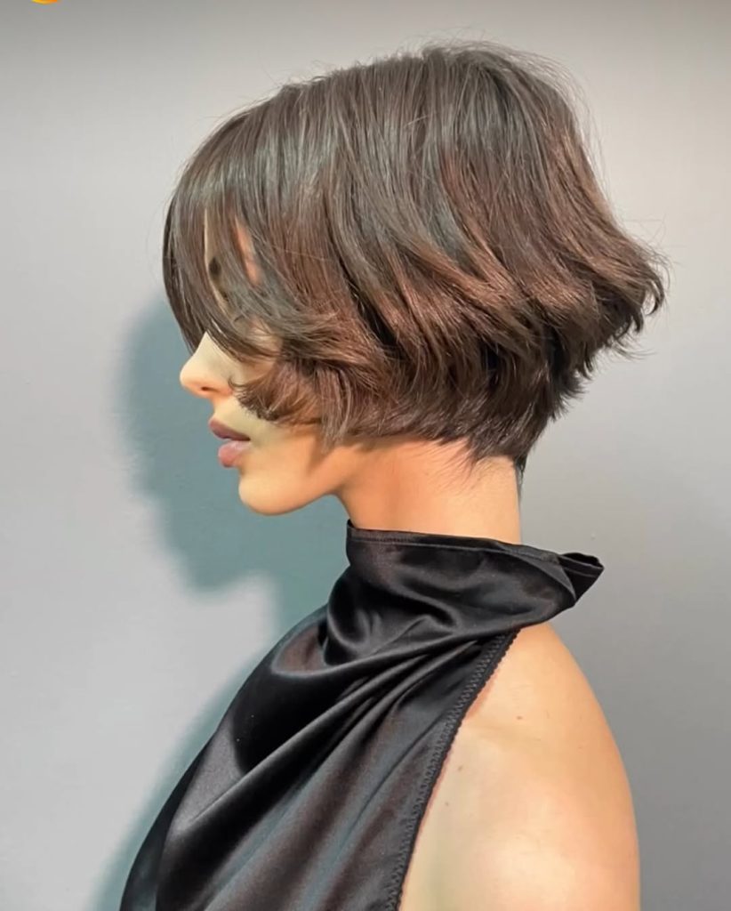 The key is the styling direction: lift at the crown, softness at the edges, and a side sweep that keeps the profile elegant. Ask for short layers designed to stack at the back (not thin out), and keep the top long enough to style with a light paste or volumizing spray.