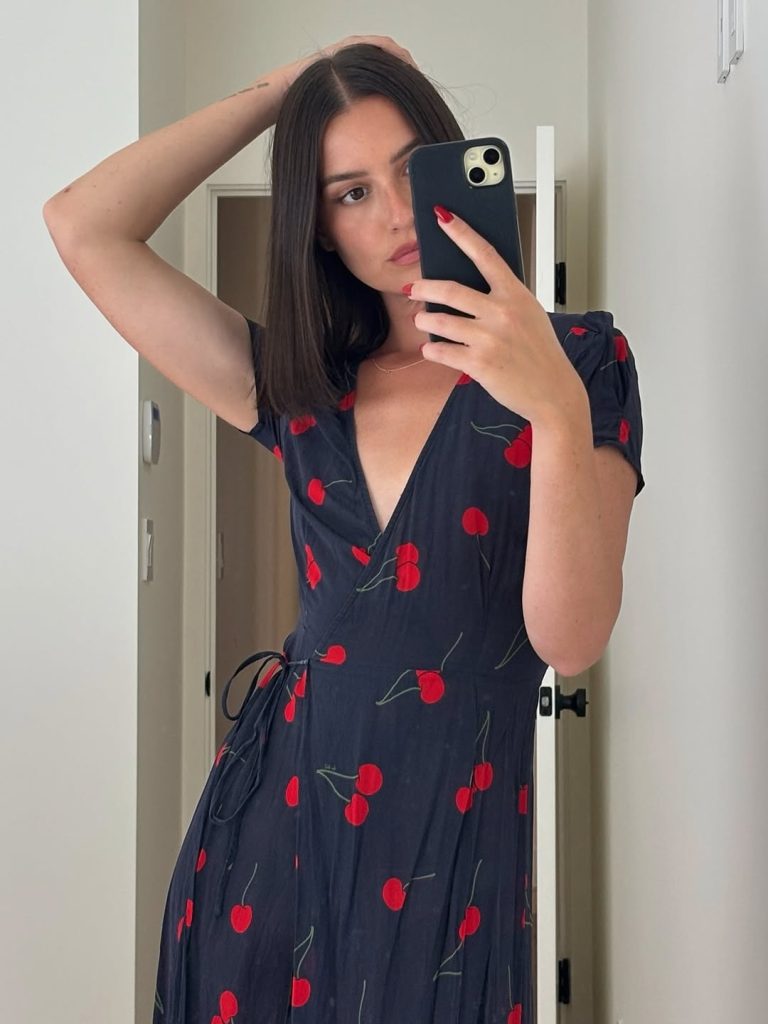 The wrap dress with a cherry print is the cherry on top (literally): playful pattern, flattering V-neck, and a tied waist that balances the sleek hair. It’s the kind of outfit that makes a straight lob feel feminine instead of severe—perfect for date night or a summer party.