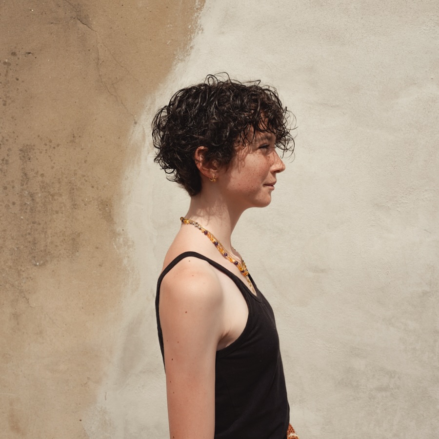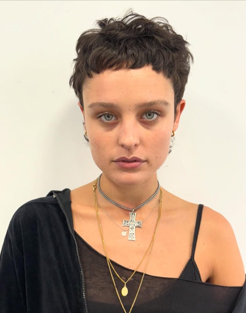 The simple black tank is exactly right here—clean and unfussy—letting the haircut be the statement. Add a layered necklace or small hoops, and you’ve got that artsy, downtown energy without trying.