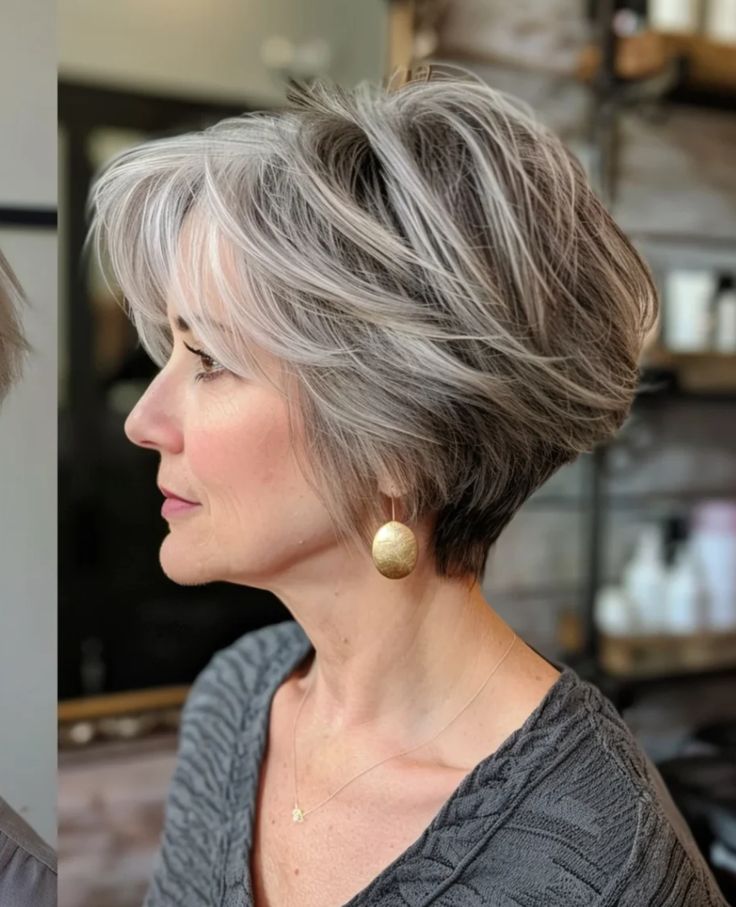 This is how you do short over 50 without going “helmet hair.” The silhouette is a pixie-bob hybrid: cropped and tapered at the nape, with longer top layers swept back for volume. The silver tone isn’t just pretty—it’s practical: multi-dimensional gray makes texture more visible, so fine hair reads fuller and more dynamic.