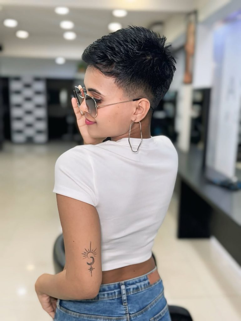 This is the lighter, softer cousin of the edgy crop—still a pixie, but with a gentler shape. The fringe is tiny and textured (bangs, but micro), and the top has airy movement that makes fine hair look thicker. Because the cut is short, every little piece of texture shows—so even thin strands can read as “a lot of hair” when styled with intention.