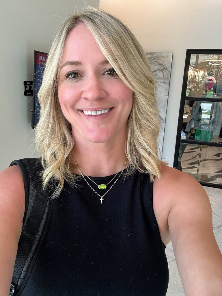 The pale blue sleeveless top is a smart pairing: the cool tone brightens the face and makes blonde dimension pop. Add small hoops and a neutral manicure, and you’re basically ready for a casual lunch meeting or a weekend road trip.