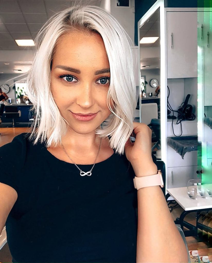 This short-leaning bob (landing around chin-to-collarbone) is a fine-hair cheat code because it creates a strong silhouette—especially when the ends are lightly textured and tucked under. The bright platinum shade amplifies the “cloudy” effect: it reflects light, which makes the hair look more dimensional and buoyant.