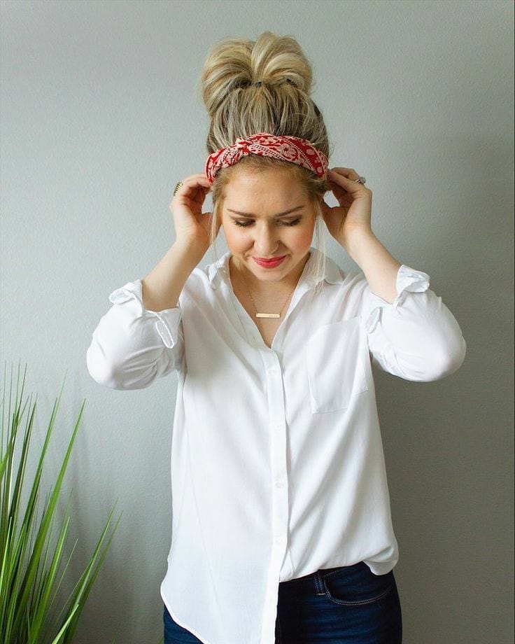 A classic red bandana knotted at the hairline plus a sky-high bun equals instant energy. It’s playful but practical—great for workouts, errands, or a casual Friday. Keep face-framing tendrils for softness; tuck the ends of the bandana under for a clean finish. Beauty editors often call this a “five-minute tutorial hairstyle,” and they’re right.