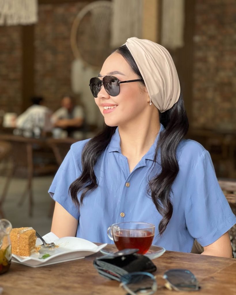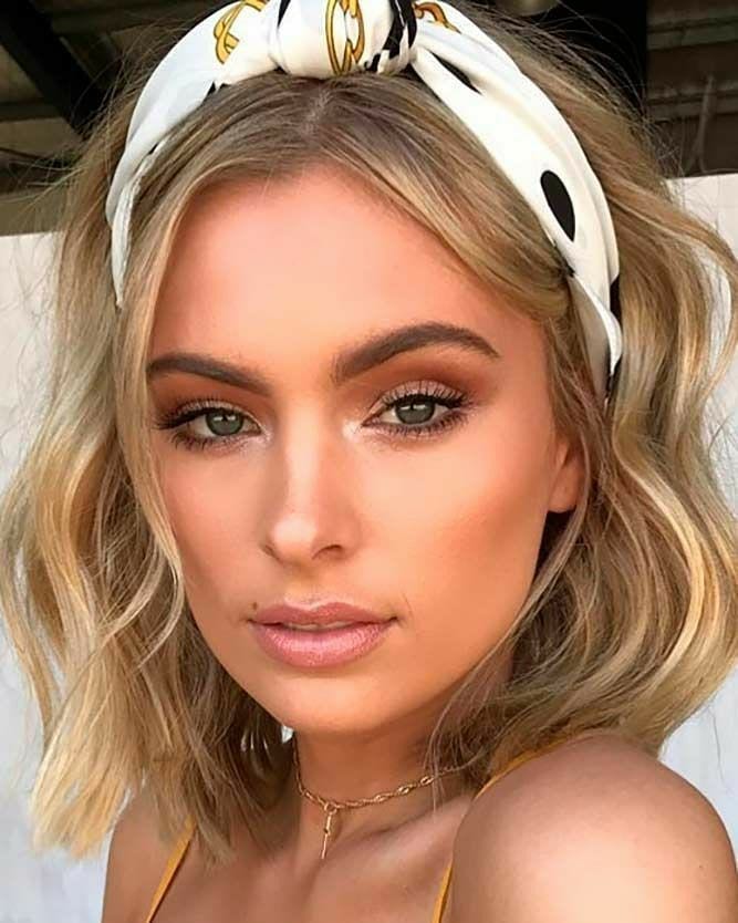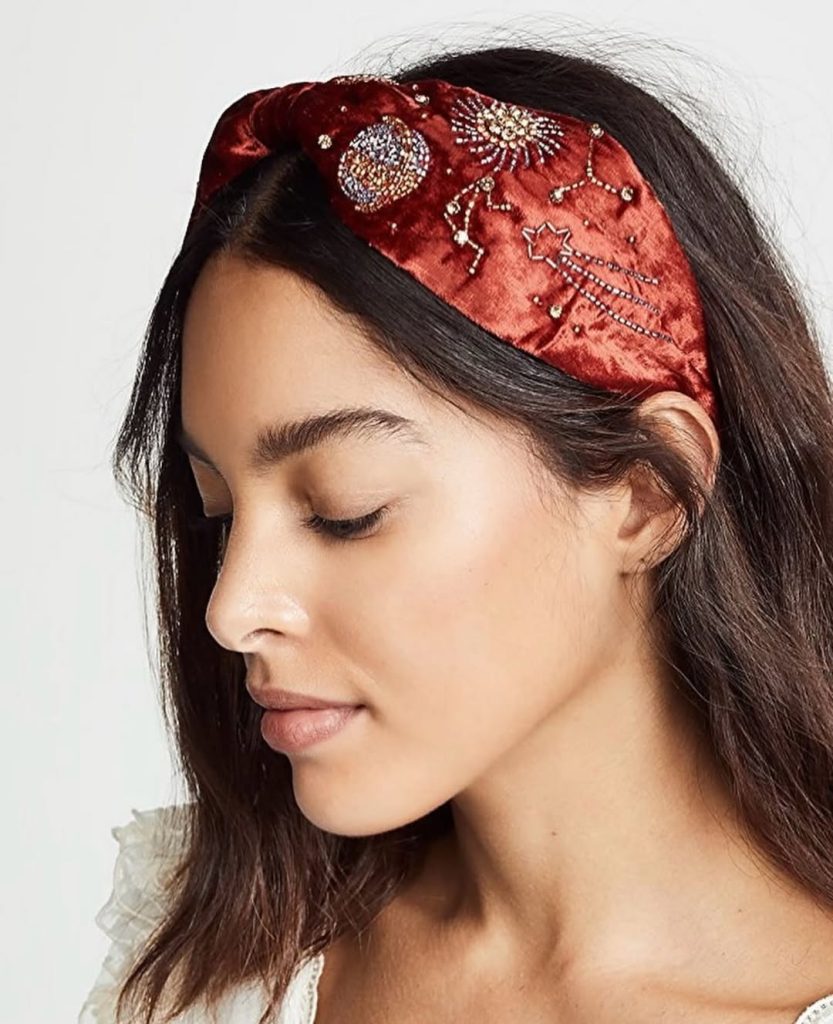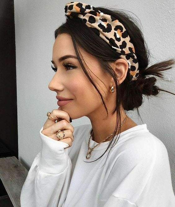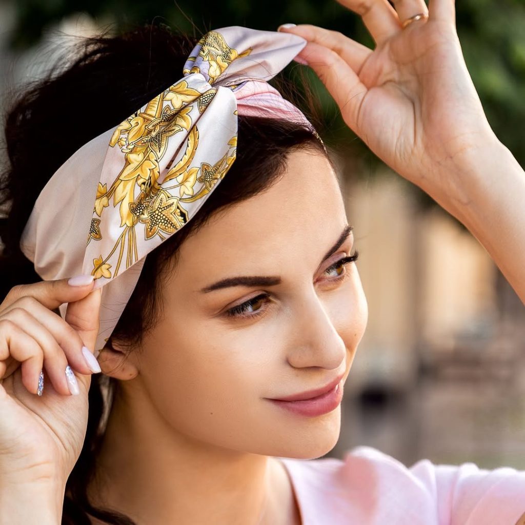 Tying a silky band into a bow looks timeless and like a statement piece, especially with prints that include some gold and neutral ivory. The sheen band will brighten your complexion and lift your soft temples, like “you slept through eight hours.” This is perfect for brunettes, with the band scarf popping against dark hair without looking harsh.