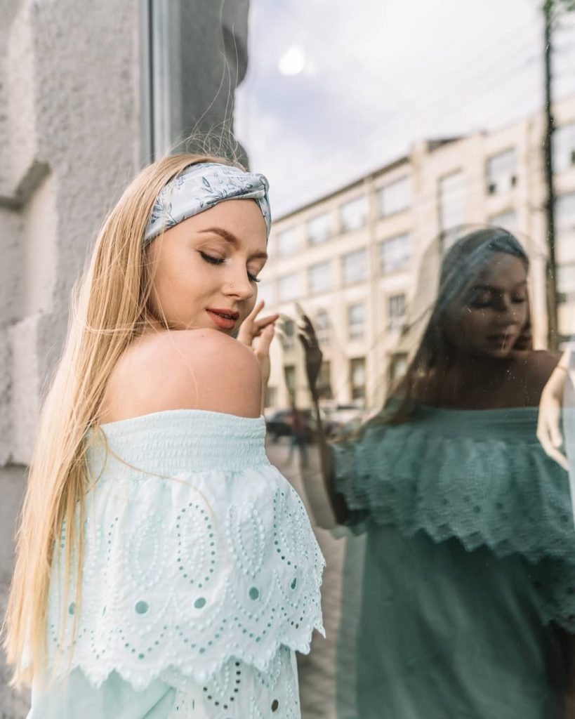 A knot headband in powder Blue pulls a look together the way a good belt does—subtle, shaping, essential. With long, straight hair, place the band one inch back from the hairline to avoid flattening; the knot creates flattering height that opens the eyes. I like this paired with airy fabrics and eyelet—think weekend markets, patio brunch, and sun-dappled walks.