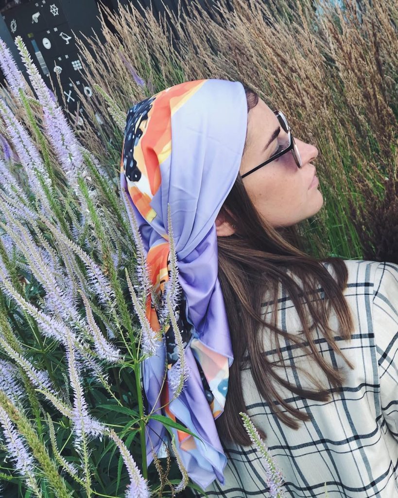 A kerchief-style tie in purple and citrus accents reads artsy-cool and travel-ready. Tie the square scarf at the nape so the tails trail—beautiful movement and a little UV protection for your part. I love this with straight or softly waved lengths and oversized sunnies.