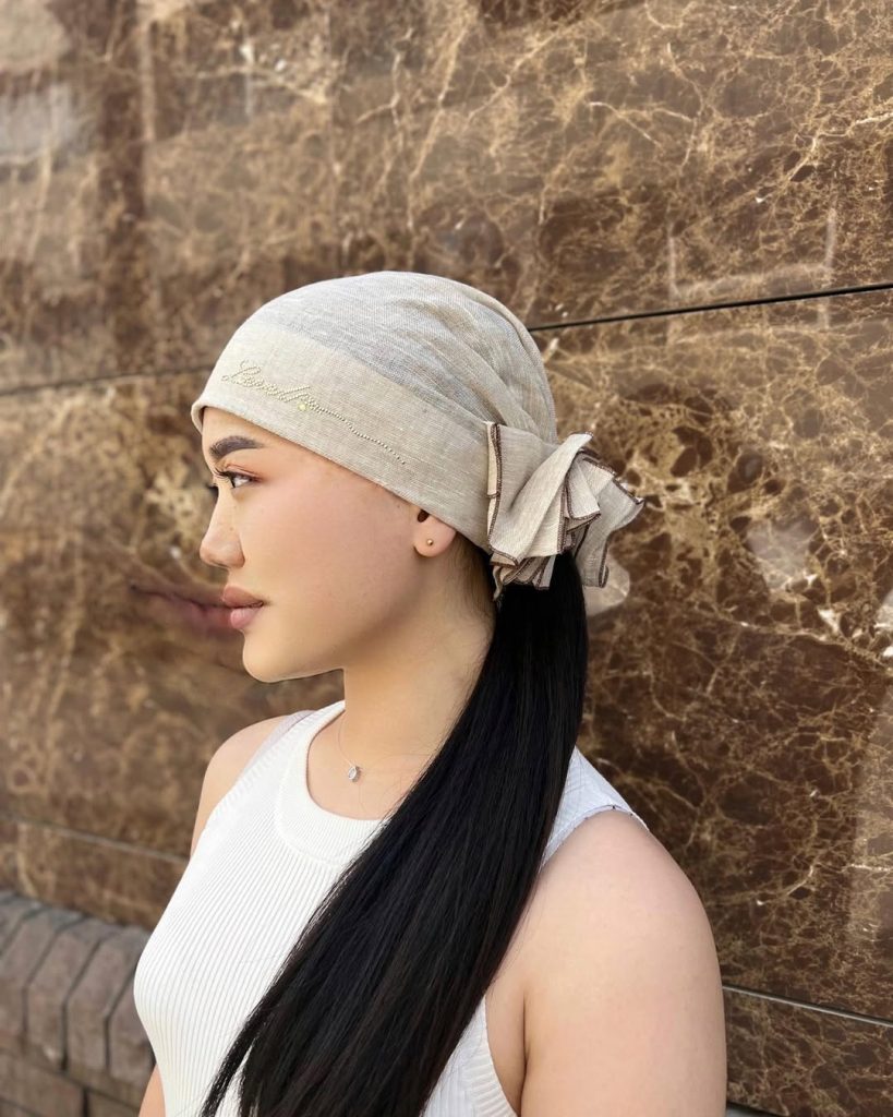 A linen square tied kerchief-style with a neat back bow is the refined way to wear long, straight hair in heat or humidity. The muted oatmeal hue feels effortlessly neutral and city-smart, while the fabric’s matte texture keeps it sophisticated for daytime.