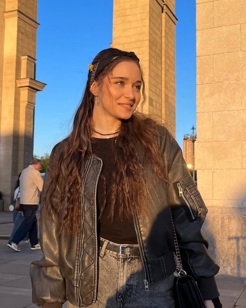 A slim black bandana worn just behind the hairline punctuates crimp-kissed waves and a bomber jacket. Caught at sunset, the look has that golden, cinematic glow that street-style photographers love. This is my pick for transitional weather and quick weekend plans.
