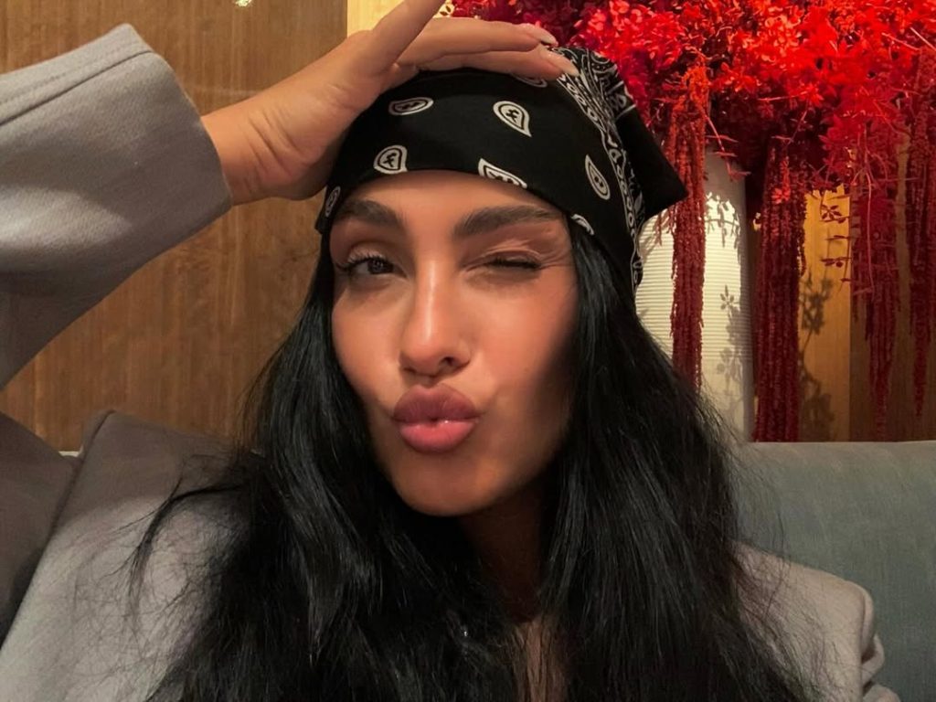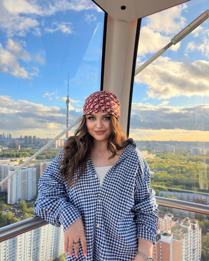 A red patterned kerchief meets oversized blue gingham for a playful high-low mix that feels made for Ferris wheels and skyline views. Keep waves loose and glossy so the print contrast stays the focal point. Beauty note: rosy cheeks and fluttery lashes complement the vintage-meets-modern mood.