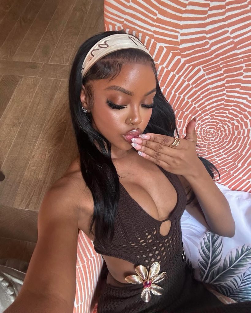 A cream scarf headband frames ultra-sleek hair and plays beautifully against a cocoa crochet dress—proof that accessories can set the whole narrative. The palette is rich brown with a hint of gold hardware at the waist, perfect for rooftop cocktails or resort dinners.