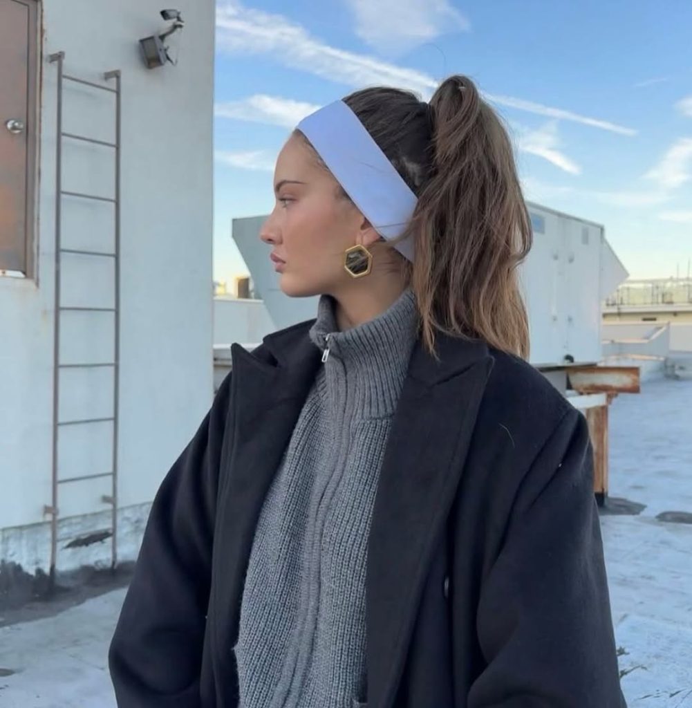 A wide, athletic headband in soft blue lifts the roots and keeps layers tidy, while a high pony adds movement and height. The cool tone pairs sharply with a charcoal knit and black outerwear—great for windy rooftops, farmers’ markets, or brisk commutes.
