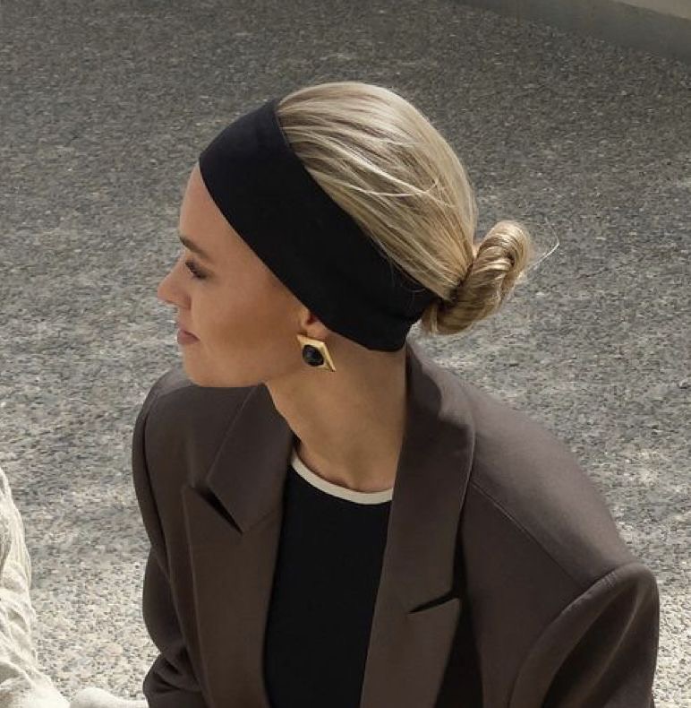 A streamlined black band anchors a sleek, low knot—an elegant solution for office days and dinners. The wide width smooths flyaways and creates a lifted silhouette; a clean center part keeps it modern. Pair with a tailored blazer and subtle studs for a quietly luxurious vibe.