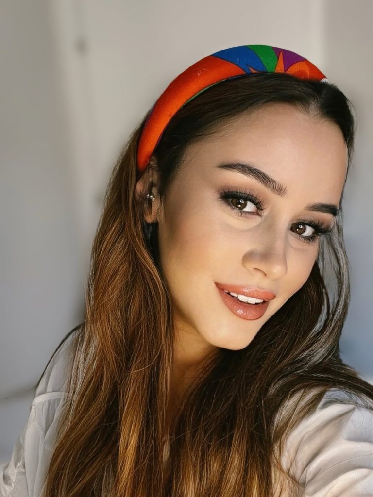 A padded headband splashed with saturated orange, blue, and green turns soft waves into an editorial statement. The height from the padding subtly lengthens the face, and the playful palette invites minimal makeup—think bronzy lids and balm. Pair with a white shirt to let the color story lead, or echo a hue with a micro-bag for a coordinated aesthetic. Bold Design done the wearable way in 2026.