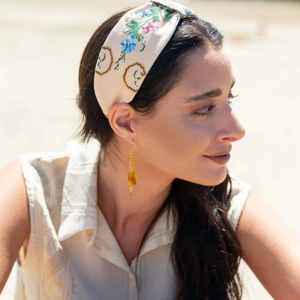 A padded, neutral headband with delicate floral embroidery (with design) feels artisanal and feminine. It softens sleek lengths and frames the face beautifully, especially with golden drop earrings—subtle “with gold” accents that tie the look together. Keep the hair smooth with a light pass of a flat iron, then place the band just behind the hairline for lift without pressure. Ideal for garden parties, brunch, or summer events when you want polish, not rigidity.