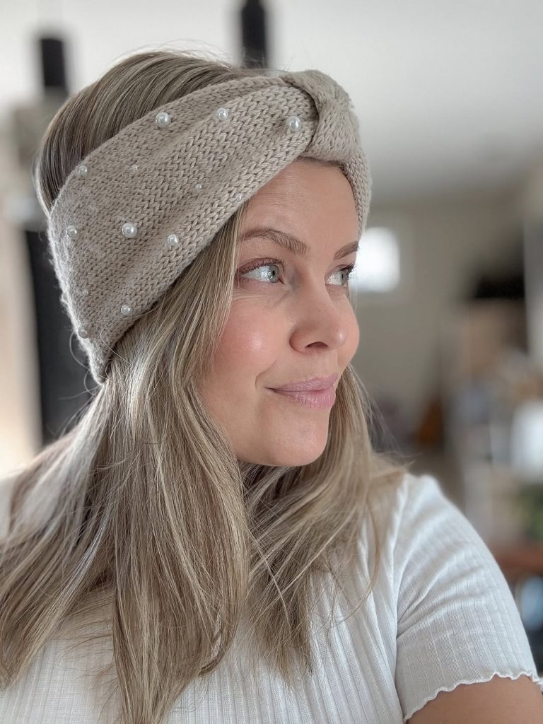 A cozy twist headband in oat neutral knit dotted with petite pearls (with design) is a cold-weather favorite. It warms ears, adds crown height, and flatters straight, shoulder-skimming lengths. Pair with a ribbed white tee or quilted jacket; finish with a rosy balm for an easy glow.