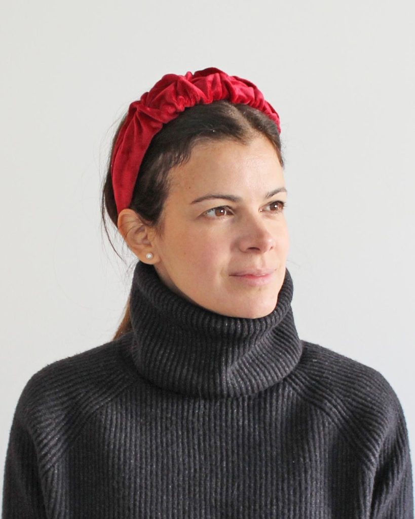A headband sewn from ruched velvet in rich red adds instant polish to a charcoal turtleneck. The texture adds height while softening a slick ponytail or straight lengths. Wear a blurred berry lip to complement the tone—cozy, elegant, and ideal for crisp-air days.