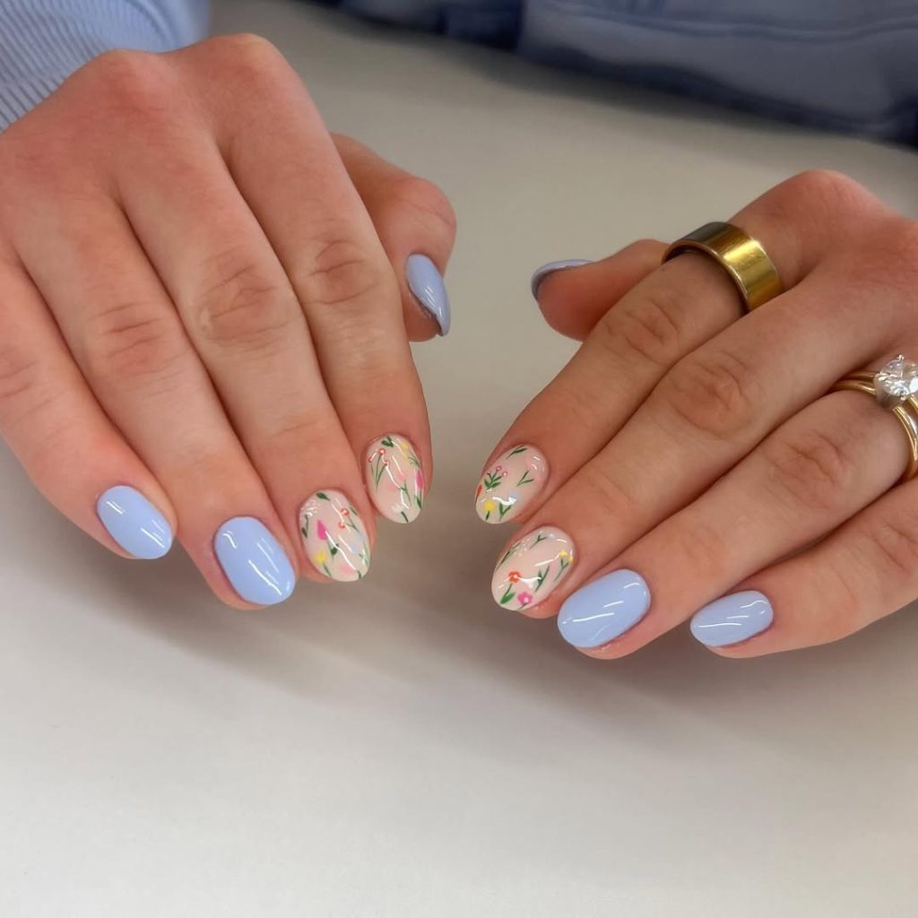 This manicure captures the quiet elegance that dominates ideas simple for early spring. A baby blue base paired with delicate floral art feels light, optimistic, and wearable. The short, rounded length keeps the look practical — perfect for women who type, travel, or juggle busy schedules.