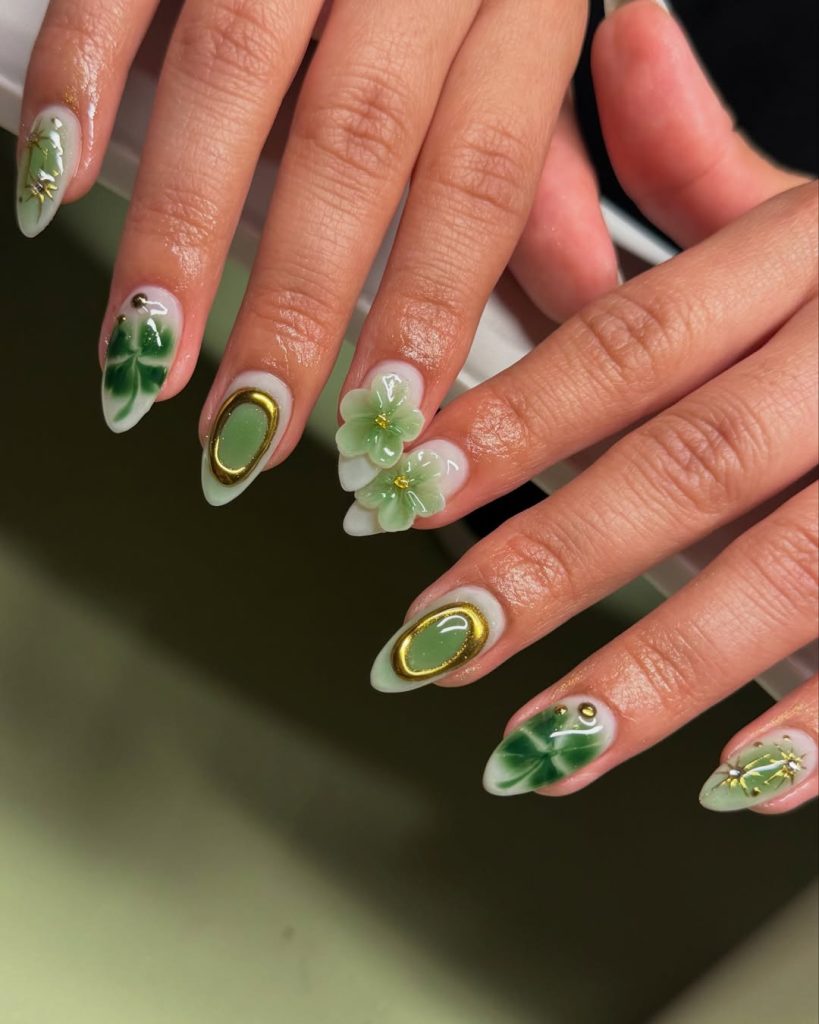 Green nails dominate March, and this design speaks directly to ideas st. patrick’s without slipping into novelty. Soft emerald and sage tones are paired with botanical detailing and subtle gold accents, elevating the look into true designs spring territory.