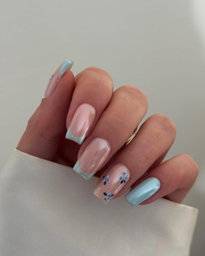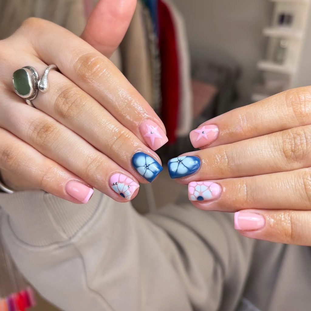 Blue & Pink Floral Accent Nails With Modern Contrast