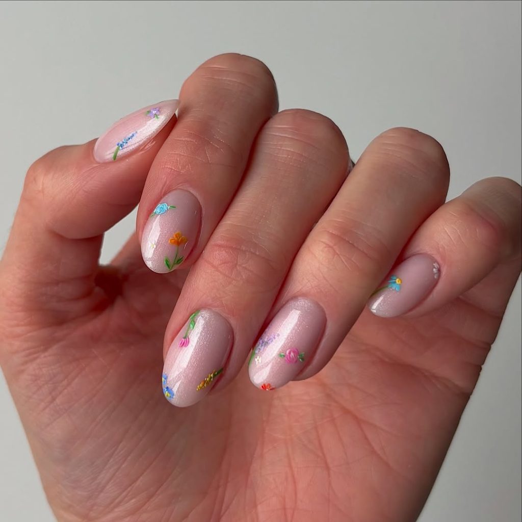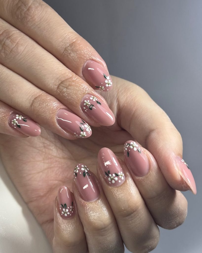 For lovers of short nails, this look proves that length isn’t required for elegance. A pearlescent pink base gives the nails a healthy glow, while tiny floral accents add charm without overpowering the design.
