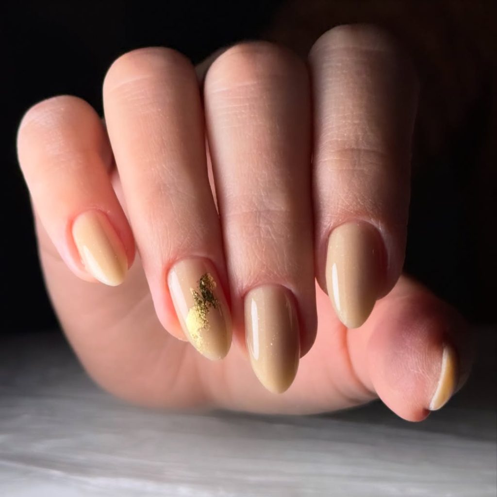 The almond shape and restrained metallic accent make this manicure ideal for women who prefer elegance over embellishment. Beauty editors often cite gold accents as a key micro-trend in designs spring, especially when paired with neutral palettes.