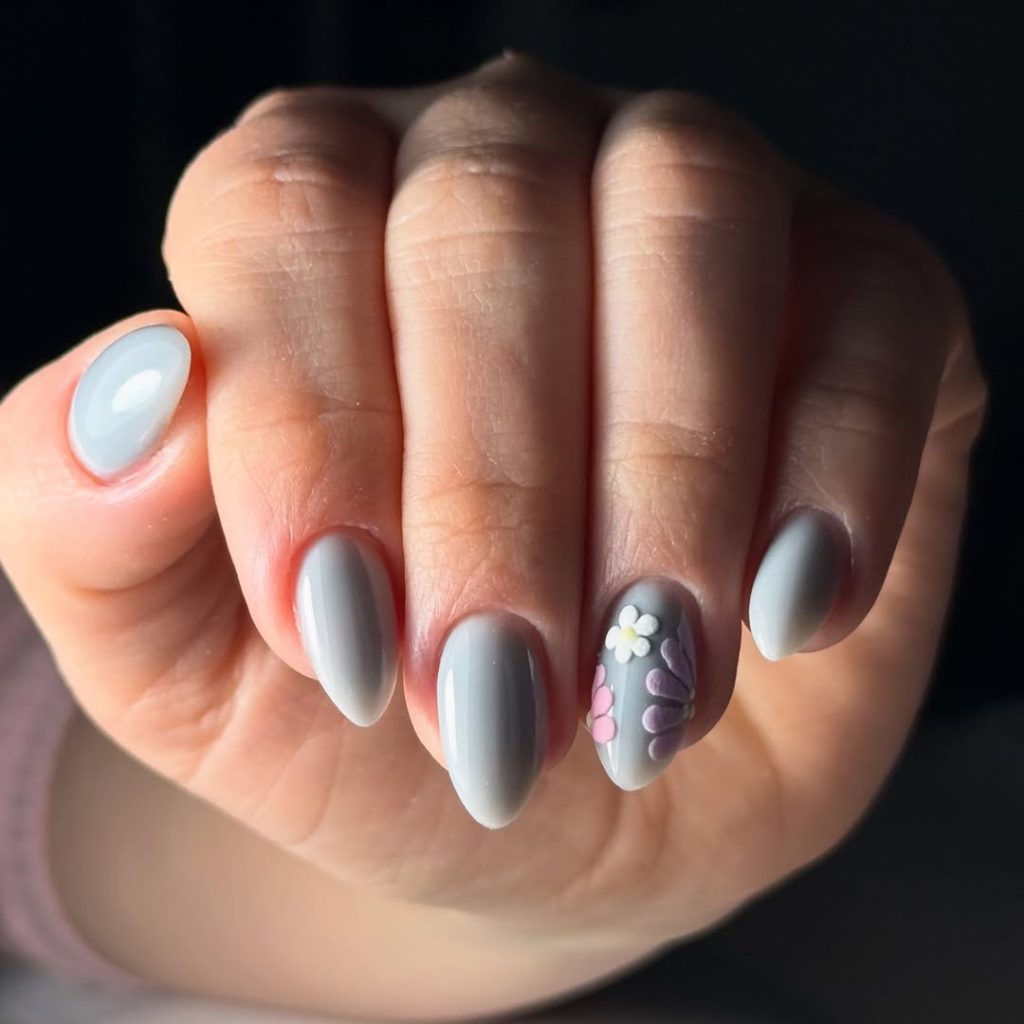 Cool-toned gray might not be the first shade that comes to mind for spring, but in March 2026, it feels unexpectedly fresh. This almond-shaped manicure uses a smooth gray base paired with a single floral accent nail in soft lavender and white. The contrast is subtle, making the look classy rather than seasonal-themed.
