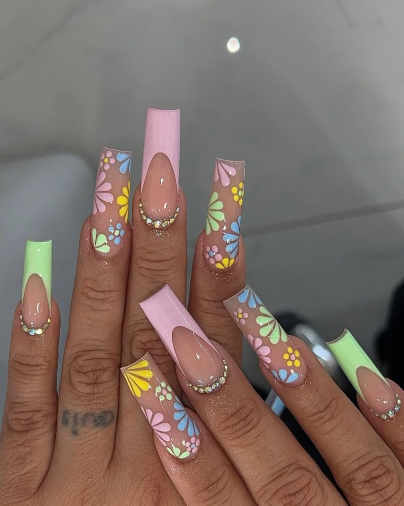 This manicure leans fully into ideas spring 2026 with playful pastels, bold floral art, and statement length. The square acrylic shape creates a strong canvas for mint green, soft pink, and sunshine yellow accents, while rhinestone cuticle detailing adds a polished finish.