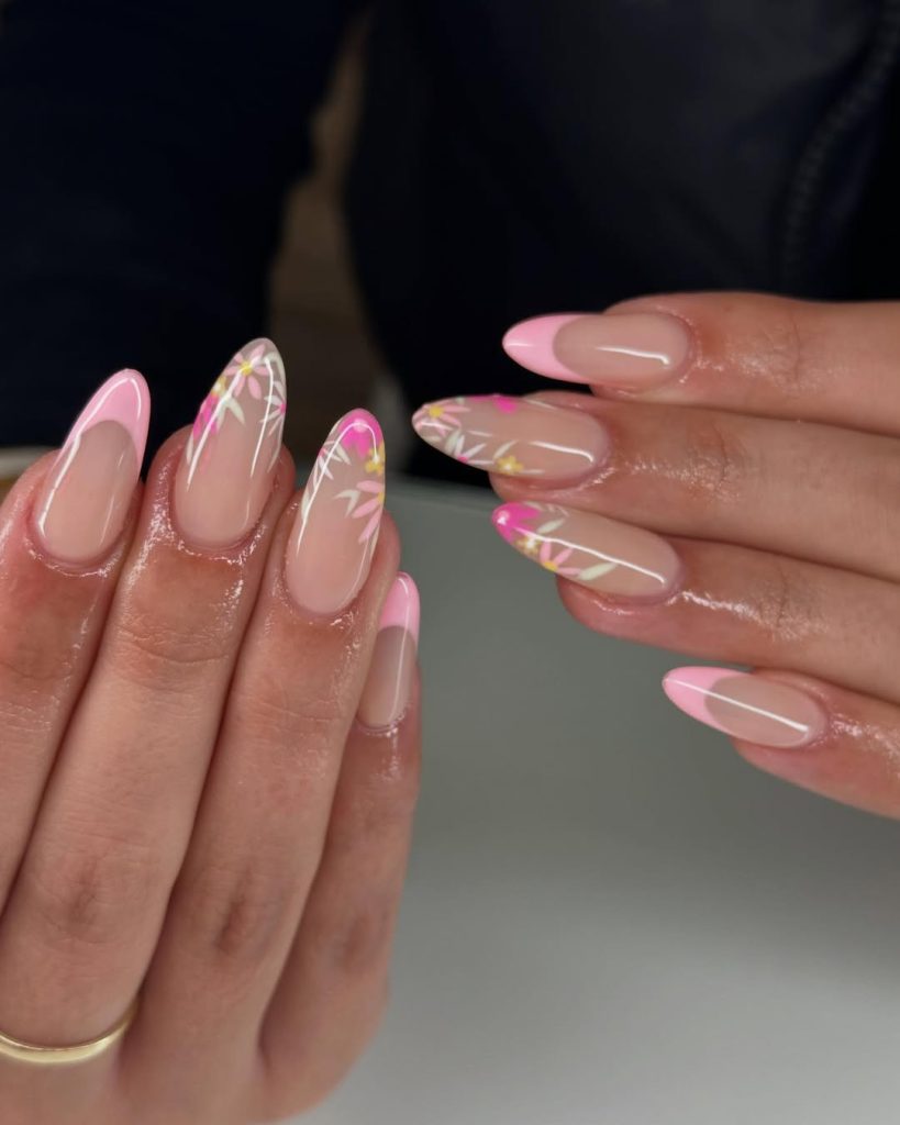 Graphic floral detailing gives this blush-pink manicure a modern edge. Thin white lines and pastel flower tips create visual interest while maintaining a refined silhouette. The almond shape elongates the fingers, adding to the overall elegance.