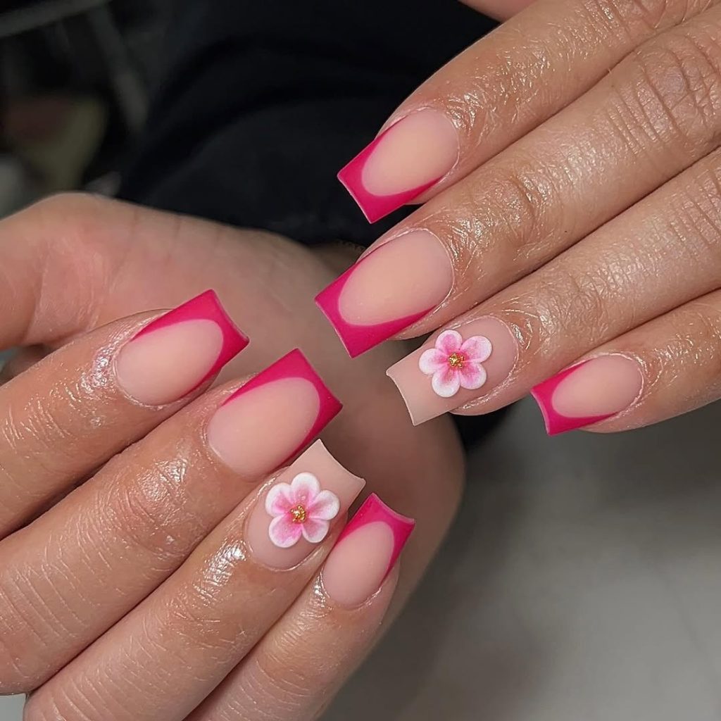 Bold doesn’t disappear in spring — it just gets refined. This manicure pairs hot pink French tips with a soft nude base and a single 3D floral accent, creating a confident yet balanced look.