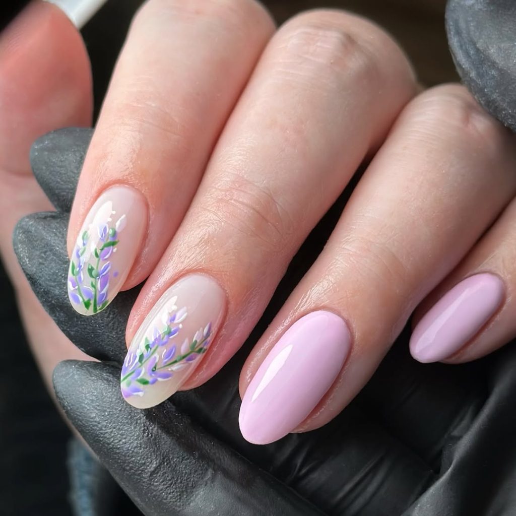 Minimal, delicate, and quietly romantic — this manicure leans into the softer side of ideas spring 2026. A translucent nude base allows hand-painted lavender stems to take center stage, creating a natural, almost ethereal effect.