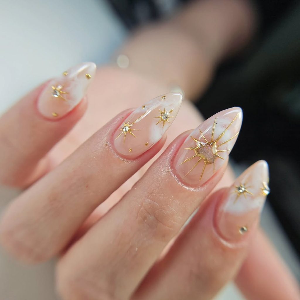 This design proves that neutral nails can still feel luxurious. A milky nude base is elevated with tiny gold studs and subtle marble veining, giving the nails dimension without excess shine.