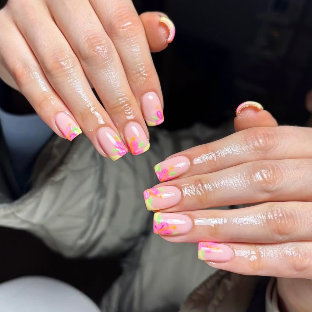 This manicure captures the gentle reset March always brings. A translucent blush base keeps things timeless, while pastel French tips edged in lemon yellow feel fresh without being flashy. The hand-painted floral accents add Art Inspo 2026 energy — playful but controlled. This is a perfect example of Ideas spring 2026 done right: light, optimistic, and wearable.
