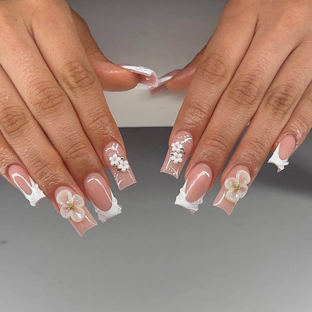 Neutral Acrylics With Sculpted White Floral Accents