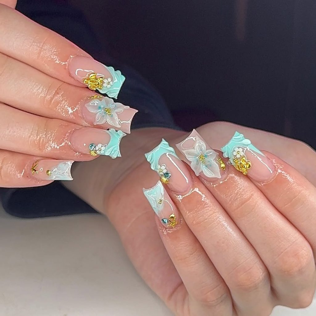Soft mint tips instantly signal spring, but it’s the gold accents that make this design feel elevated. The balance between pastel color and metallic detail fits seamlessly into Designs Designs spring trends for 2026, where contrast is used sparingly and thoughtfully.