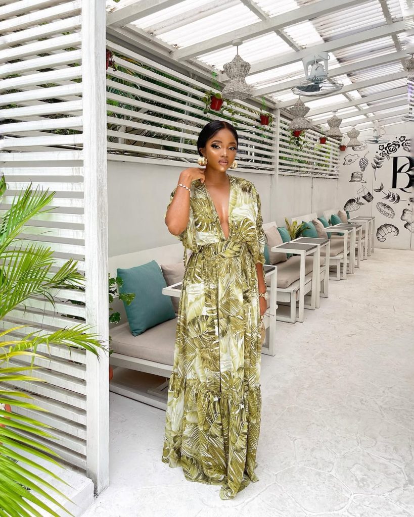This one’s for tropical leaf maxi dresses in striking plunging V-necklines, perfect for brunches at resorts and warm summer days, especially for Black women’s fashion.