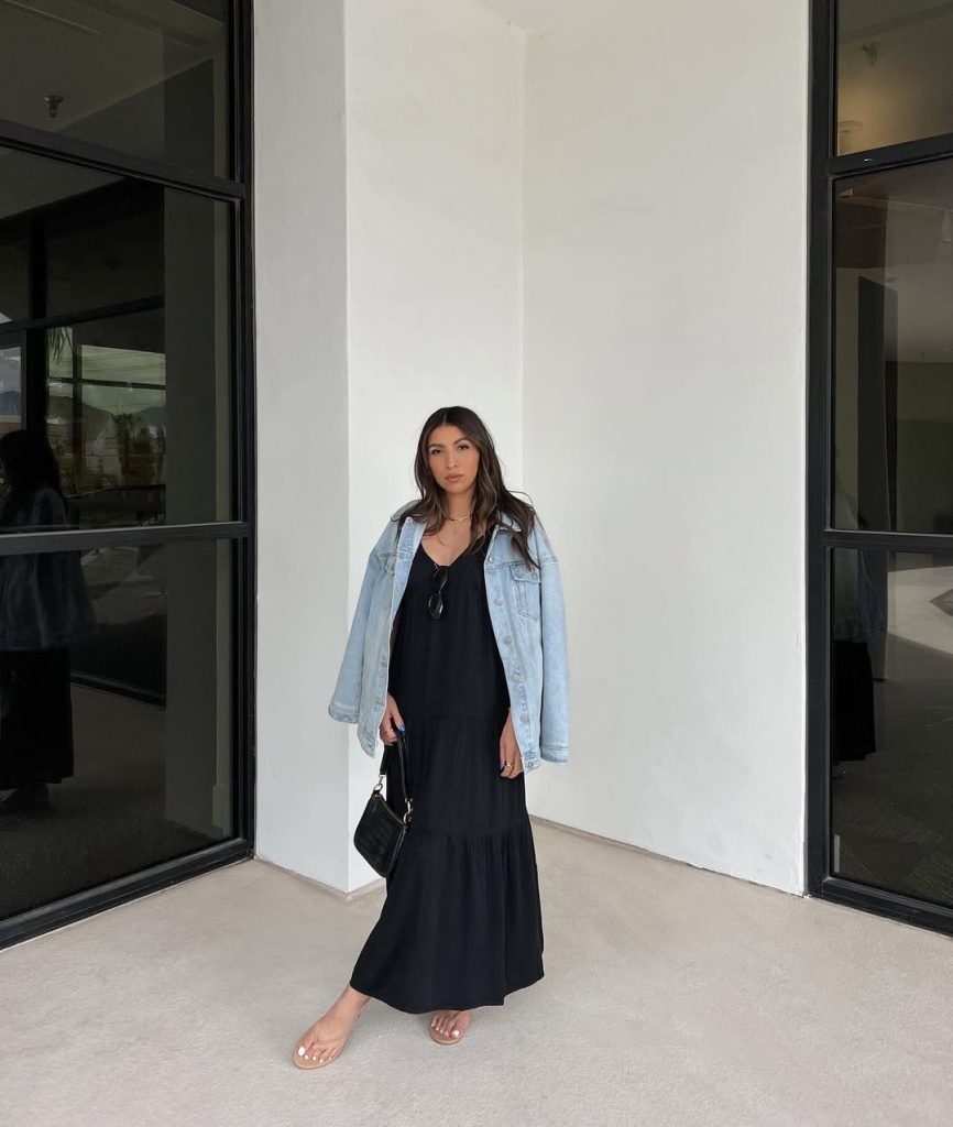 A tiered black maxi dress paired with a light denim jacket creates the kind of easy casual uniform that always works for errands, coffee dates, or school pickup.
